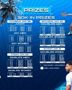 - M/ W/ MX Doubles and Singles prizes (60% MONEY AND 40% MERCHANDISE AND VOUCHERS).
